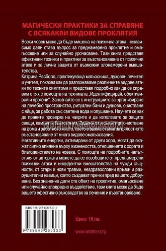 Катрина Расболд, практикуваща магьосница, духовен лечител и учител, показва как да разпознаваме различните видове атаки по техните симптоми и представя подробно как да се справим с тях с помощта на техниката — Идентифицирай, обективирай и прогони. Запознайте се с инструкциите за организиране на лечебно пространство, ритуални бани и душове, очистване с яйце, за работа със светена вода и опушване. Научете се как да правите проверка на чакрите и да използвате за защита свещи, камъни и благовония. Дадени са и съвети за очистване на дома и работното място, което е важна стъпка за цялостното възстановяване от много видове омагьосвания.