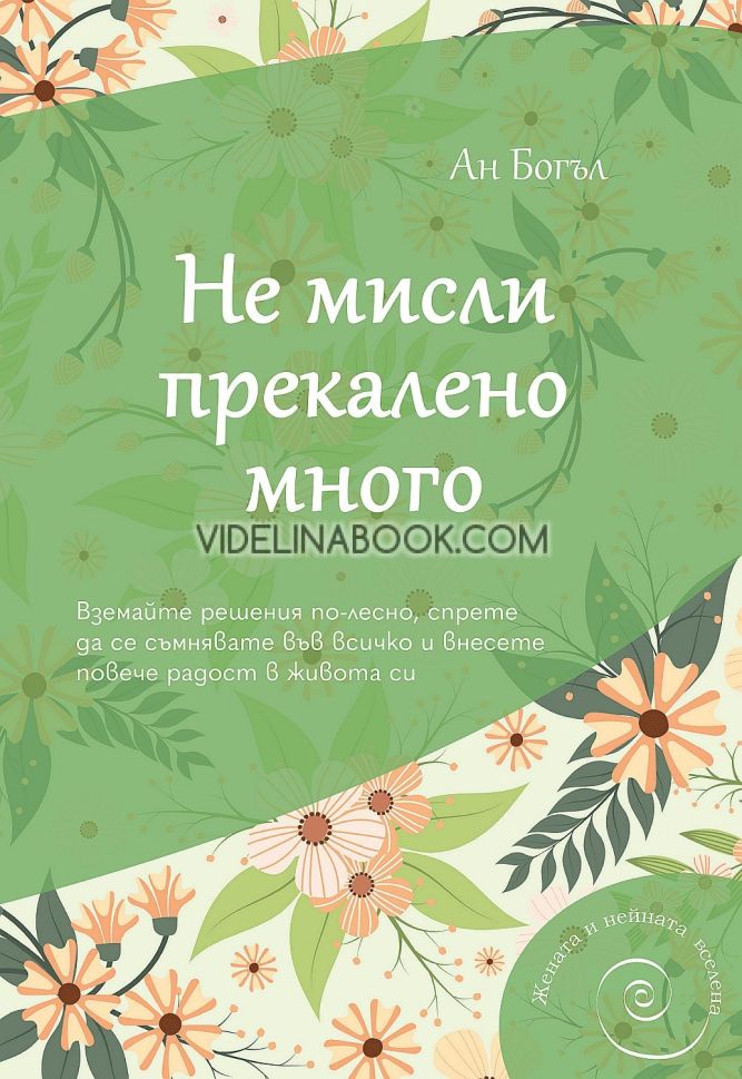„Не мисли прекалено много“ от Ан Богъл е практичен и вдъхновяващ наръчник, предназначен за хора, които искат да освободят ума си от нерешителност, страх и излишно премисляне. Книгата предлага стратегии за вземане на решения, техники за преодоляване на негативни мисловни модели и насоки за фокусиране върху истински важните неща. С помощта на автора читателите могат да изградят положителни мисловни навици, които да внесат мир, радост и любов в ежедневието.