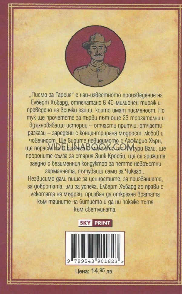 "Писмо за Гарсия" е най-известното произведение на Елберт Хъбард, отпечатано в 40-милионен тираж и преведено на всички езици, които имат писменост. Но тук ще прочетете за първи път още 23 трогателни и вдъхновяващи истории – отчасти притчи, отчасти разкази – заредени с концентрирана мъдрост, любов и човечност. Ще видите невидимото с Лафкадио Хърн, ще пораснете в бизнеса с момчето от Мисури Вали, ще пророните сълза за стария Зийк Кросби, ще се грижите заедно с безименния кондуктор за петте невръстни германчета, пътуващи сами за Чикаго…