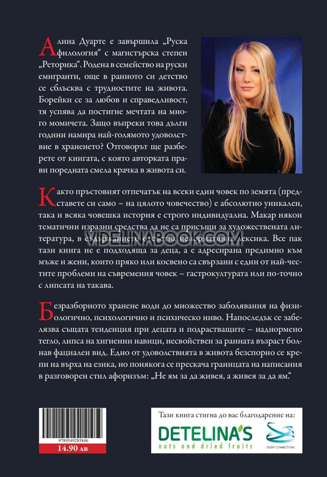 Като пръстовият отпечатък на всеки един човек по земята (представете си само – на цялото човечество) е абсолютно уникален, така и всяка човешка история е строго индивидуална. Макар някои тематични изразни средства да не са присъщи за художествената литература, в съдържанието отсъства ненормативна лексика. Все пак тази книга не е подходяща за деца, а е адресирана предимно към мъже и жени, които пряко или косвено са свързани с един от най-често срещаните проблеми на съвременния човек – гастрокултурата или по-точно с липсата на такава.