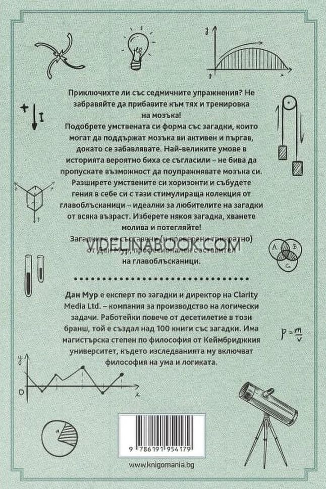 Разширете умствените си хоризонти и събудете гения в себе си с тази стимулираща колекция от главоблъсканици — идеални за любителите на загадки от всяка възраст. Изберете някоя загадка, хванете молива и потегляйте! Загадките са съставени (и проверени трикратно) от Дан Мур — професионален съставител на главоблъсканици.