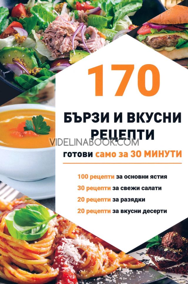 Благодарение на книгата „170 бързи и вкусни рецепти – готови само за 30 минути“ ще можете да се насладите на разнообразна, вкусна, домашно приготвена храна, като винаги ще имате свежи идеи какво да сготвите за обяд и вечеря. Насладете се на бързото готвене, без компромиси с вкуса, качеството и удоволствието от храната. Тази практична кулинарна книга е създадена специално за динамичните хора, които искат да се хранят вкусно, здравословно и домашно, но не разполагат с много време. В „170 бързи и вкусни рецепти“ ще откриете богат избор от идеи за всеки ден – от основни ястия и свежи салати, до неустоими десерти и разядки, които ще внесат разнообразие и удобство във вашата кухня.