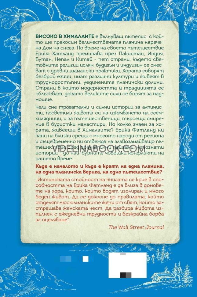 Високо в Хималаите е вълнуващ пътепис, с който ще прекосим величествената планина, наречена Дом на снега. По време на своето пътешествие Ерика Фатланд преминава през Пакистан, Индия, Бутан, Непал и Китай – пет страни, където световните религии ислям, будизъм и индуизъм се смесват с древни шамански практики. Хората говорят безброй езици, имат различни култури и живеят в труднодостъпни, уединени планински долини. Страни, в които модерността и традицията се сблъскват, докато великите сили се борят за надмощие. Чели сме трогателни и силни истории за алпинисти, посветили живота си на изкачването на осемхилядници, и за пътешественици, търсещи смирение в будистки манастири. Но колко знаем за хората, живеещи в Хималаите? Ерика Фатланд ни кани на близки срещи с многото народи от региона и същевременно ни отвежда на главозамайващо пътешествие сред драматични пейзажи, непознати истории – до най-бурните човешки конфликти на нашето време.