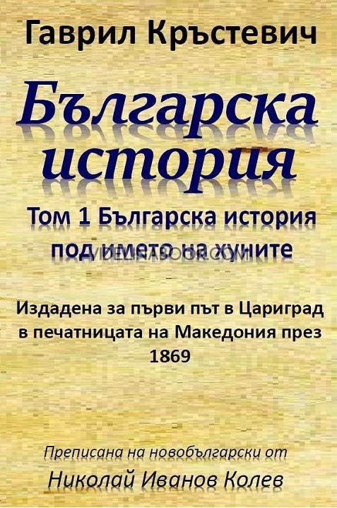 Българска история – том 1: Българска история под името на хуните от Гаврил Кръстевич е мащабно историческо изследване, което проследява произхода и ранната история на българския народ, като го свързва с етнонима „хуни“ в античните и средновековни извори. Книгата е написана с научна прецизност, но и с патриотична страст, характерна за възрожденската епоха, в която историческото знание се превръща в инструмент за национално пробуждане.