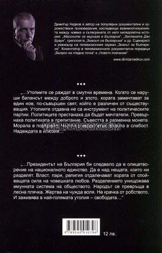 "Утопиите се раждат в смутни времена. Когато се наруши балансът между доброто и злото, хората замечтават за един нов, по-съвършен свят, който е различен от съществуващия. Утопиите отдавна не са инструмент на политическите партии. Политиците престанаха да бъдат мечтатели. Превърнаха политиката в препитание. Съвестта в разменна монета. Морала в портфейл. Честта в недостатък. Вярата в слабост. Надеждата в илюзия...