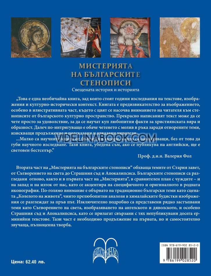 „Мистерията на българските стенописи, част втора: Свещената история и историята“, публикувана от издателство Инле, е книга, разказваща (именно разказваща!, а не информираща!) живота на идеи, въплътени в образи. Разказ, здраво стъпил на солидни теологически, исторически, културологични и изкуствоведски знания. За много хора днес, както за живелия през VI век св. Григорий Двуеслов, стенописите са библия за неграмотни. Авторките не са съгласни с това определение и увлекателно развиват своите доводи, че изображенията разкриват развиващ се свят, който е в непрекъсната връзка с писаното канонично и неканонично слово, с представите и културната памет на християните както на Изток, така и на Запад от най-ранните векове до днес.