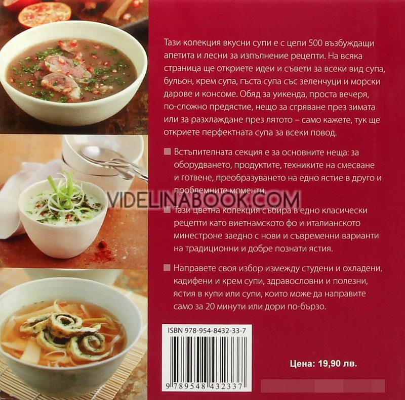 „500 супи: Единствената колекция рецепти за супи, която ви трябва“ от Сузана Блейк е цялостен и вдъхновяващ наръчник за любителите на топли и студени супи, подходящ за всякакви поводи и сезони. Книгата съдържа 500 разнообразни рецепти, които обхващат всичко – от класически бульони и крем супи, до екзотични предложения с морски дарове, зеленчуци и подправки. Това я прави незаменим помощник в кухнята, независимо дали търсите бърза вечеря, уикенд обяд или празнично предястие.
