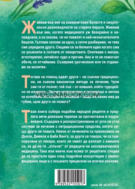 Тази книга събира подобни народни рецепти и предлага вече доказани терапии за прочистване и оздравяване. Съдържа и разпространявани от уста на уста системи за лечение с нетрадиционни средства, когато нищо друго не помага. Някои от леченията са приписвани на Дънов, Димков и Ванга, за други се говори, че са препоръчани от лекари, които не смеят да излязат с имената си, за да не ги отлъчат от консервативната медицина. Така или иначе към всяка от рецептите следва да се пристъпи едва след подробни консултации с квалифицирано лице и с осъзнато преценяне на всички рискове.