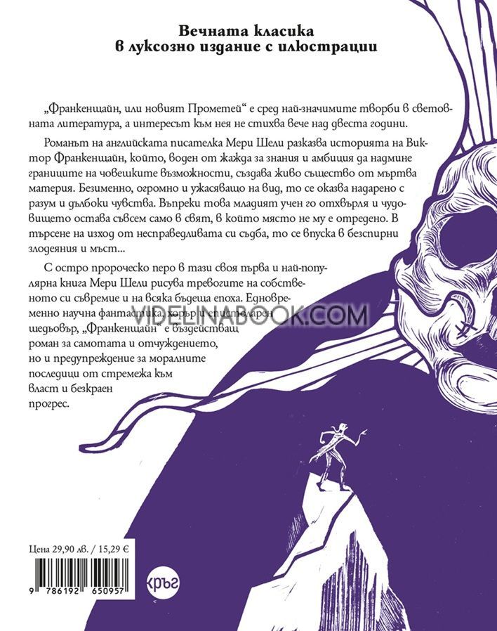С остро пророческо перо в тази своя първа и най-популярна книга Мери Шели рисува тревогите на собственото си съвремие и на всяка бъдеща епоха. Едновременно научна фантастика, хорър и епистоларен шедьовър, „Франкенщайн“ е въздействащ роман за самотата и отчуждението, но и предупреждение за моралните последици от стремежа към власт и безкраен прогрес.