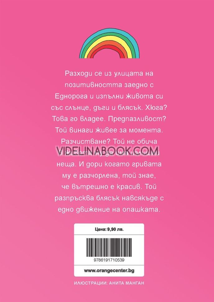 „Бъди еднорог и гледай на живота от хубавата му страна“ е едновременно забавна и вдъхновяваща книга, която те приканва да откриеш магията на себеизразяването и силата на позитивното мислене. Еднорогът е твоя въображаем учител, който те учи да поддържаш чистота в сърцето, да отхвърляш излишното и да пазиш усещането за вътрешна красота, дори в дните, когато „гривата ти е разчорлена“. С нейните кратки, но въздействащи послания, книгата е чудесен спътник за всеки, който търси повече усмивки, надежда и светлина в ежедневието.